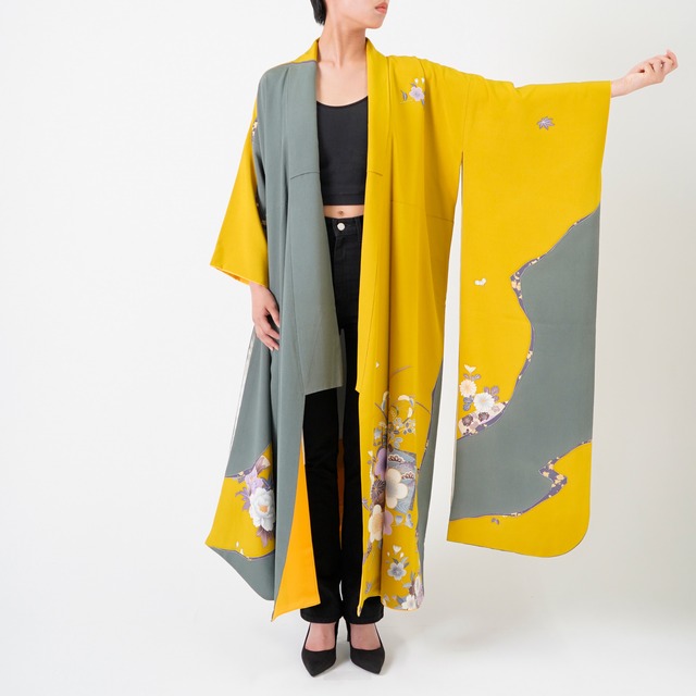 - Truly one of a kind — a garment that exists nowhere else in the world. - Created by skilled kimono artisans, this robe is handcrafted from a vintage kimono carefully selected by kimono specialists. - This piece was made from a “Houmongi” kimono — a semi-formal style traditionally worn for special occasions — giving it an elegant, refined presence. - Featuring the original fabric’s intricate patterns and craftsmanship, this piece carries a timeless sense of beauty and history. 【Size】 - Length: 128 cm (Model height: 165 cm) 【Material】 Silk 【Item Condition】 Normal vintage condition.Typical signs of age such as slight fading or minor wear. 【Care & Notes】 This item is handcrafted from a vintage kimono and should be handled with care. Due to the delicate nature of silk, it should not be washed in water. If needed, we recommend gently airing it in the shade in a well-ventilated area to refresh it. Please note that, as this piece is made from a vintage kimono, there may be slight imperfections such as small stains, spots, fraying, or fading that remain from the original material. These are not considered defects, but part of the fabric’s unique history and charm. Thank you for your understanding, and please treat this piece with care. If you have any questions, feel free to contact us via the “Contact” page in our shop.