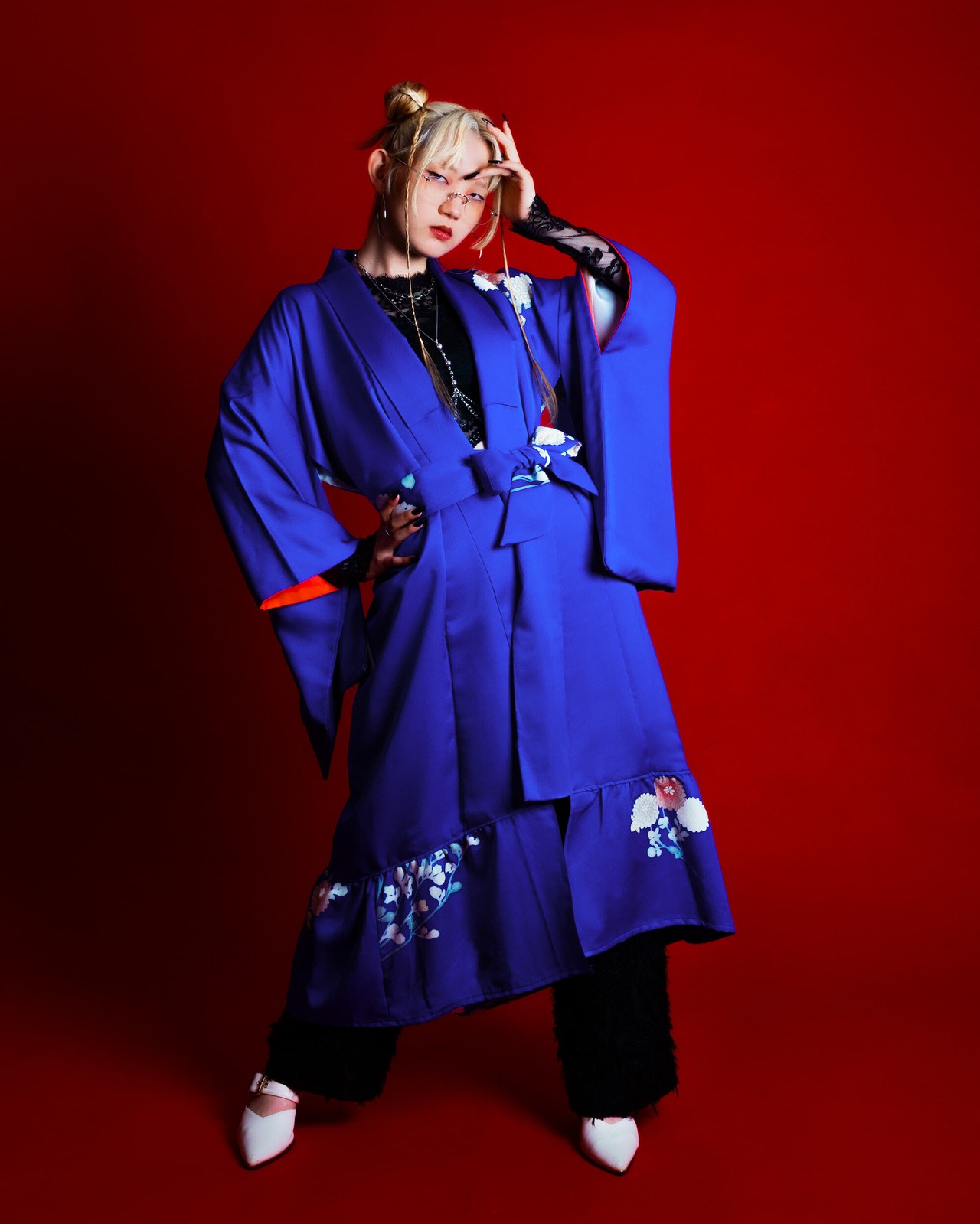 Handcrafted Robe from Vintage Kimono - Blue-purple Floral Design D010