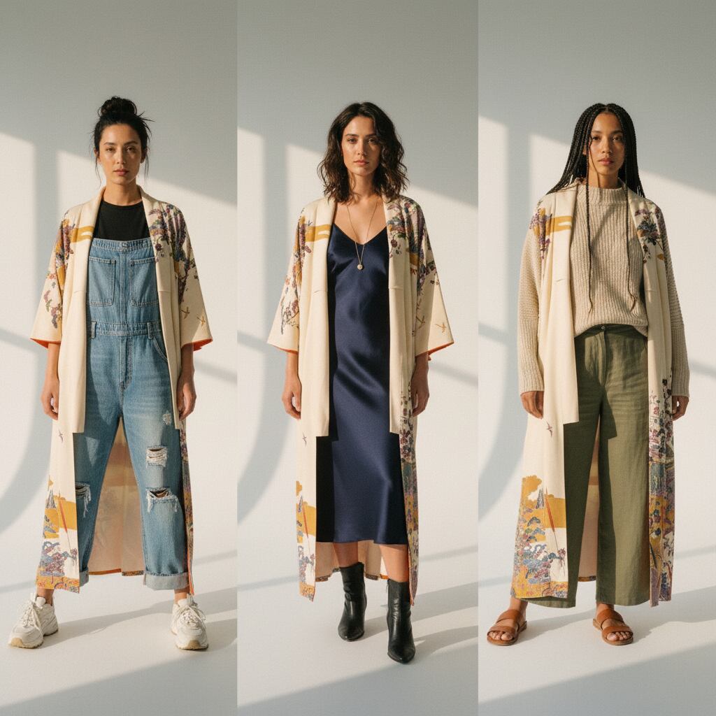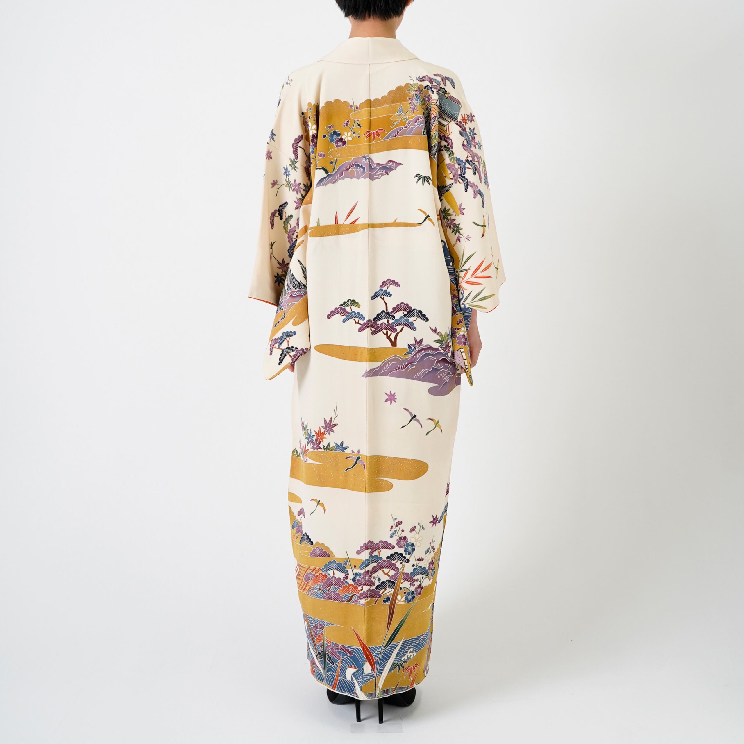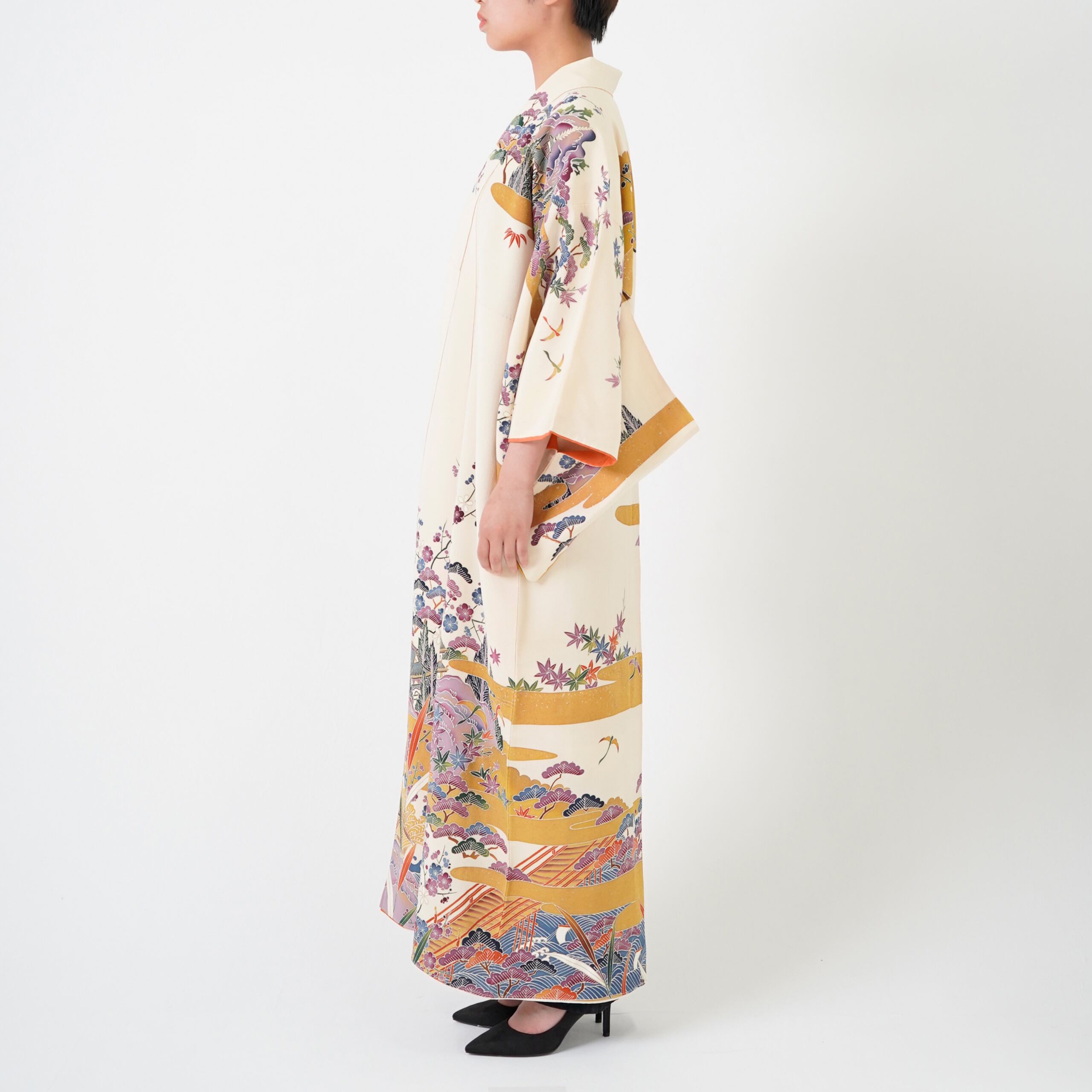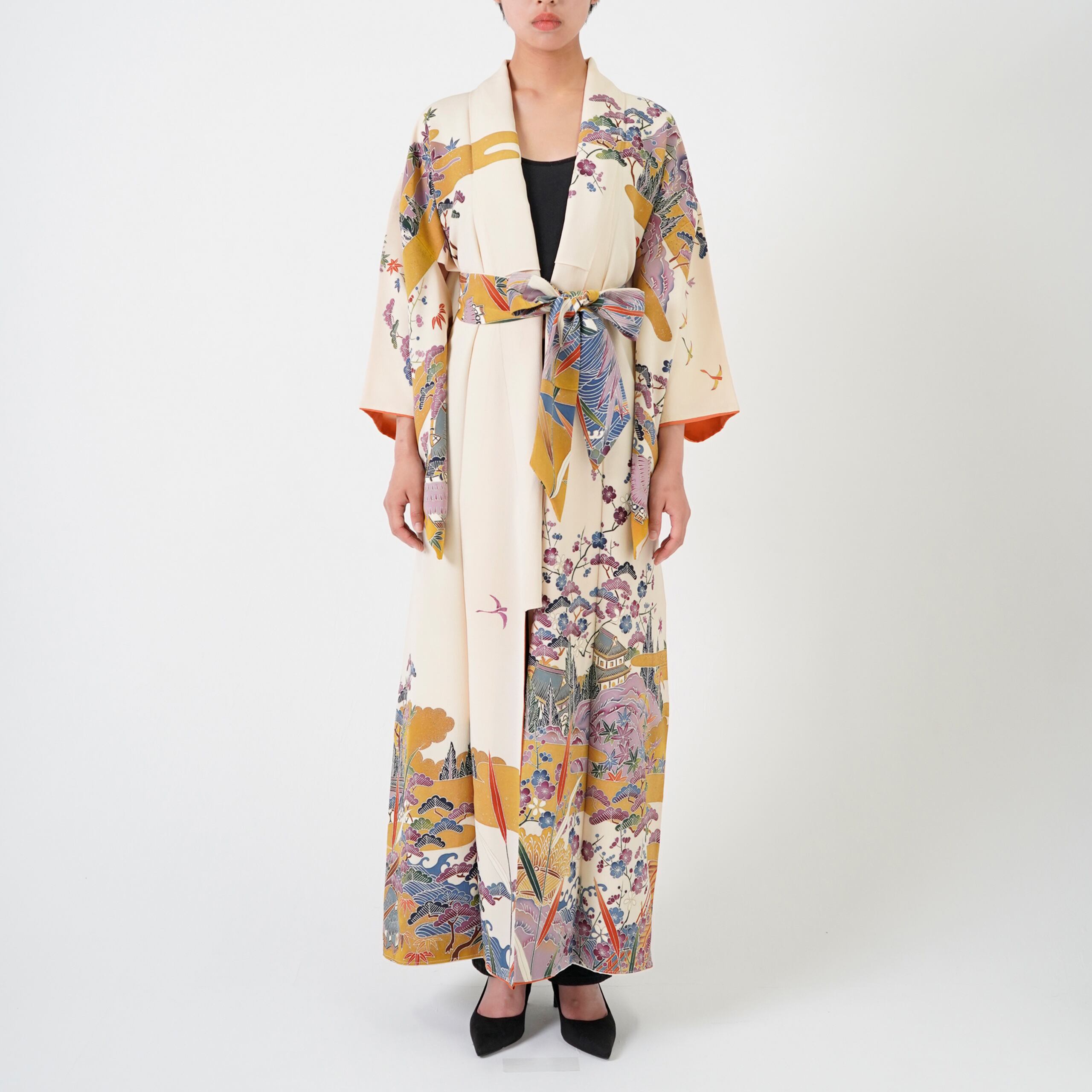 - This piece was made from a “Houmongi” kimono — a semi-formal style traditionally worn for special occasions — giving it an elegant, refined presence.