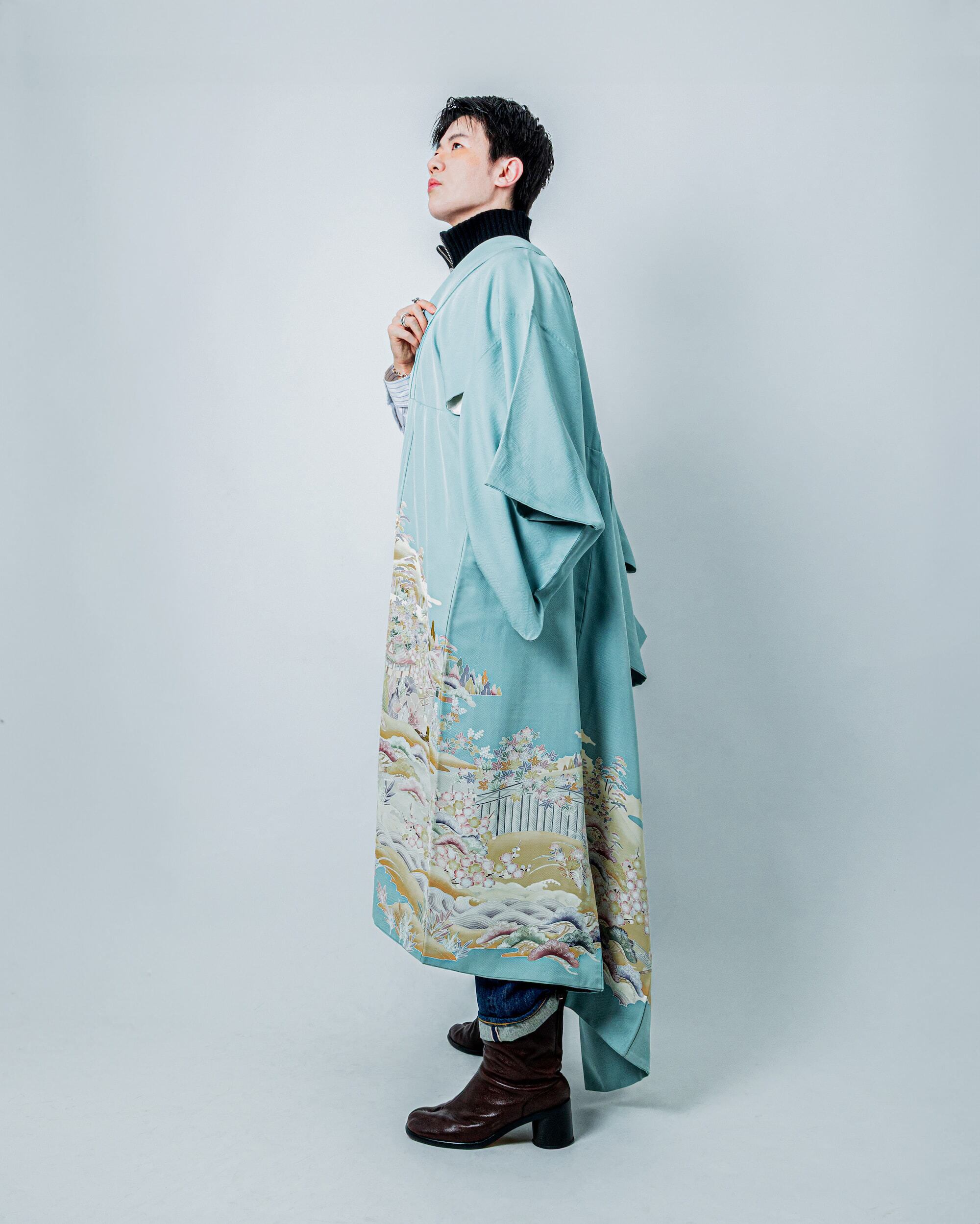 Handcrafted Robe from Vintage Kimono - Light Blue Grass Pine Design D016