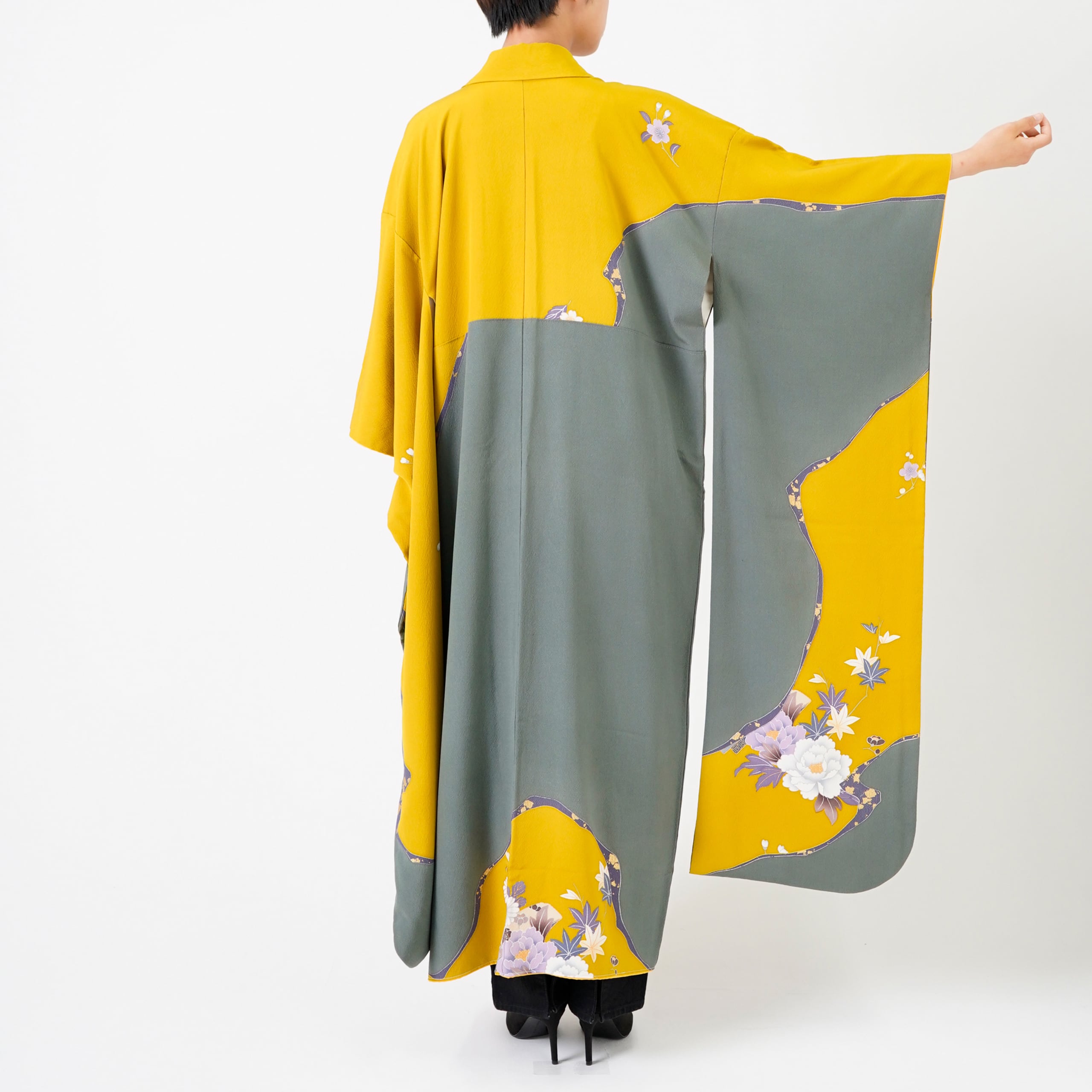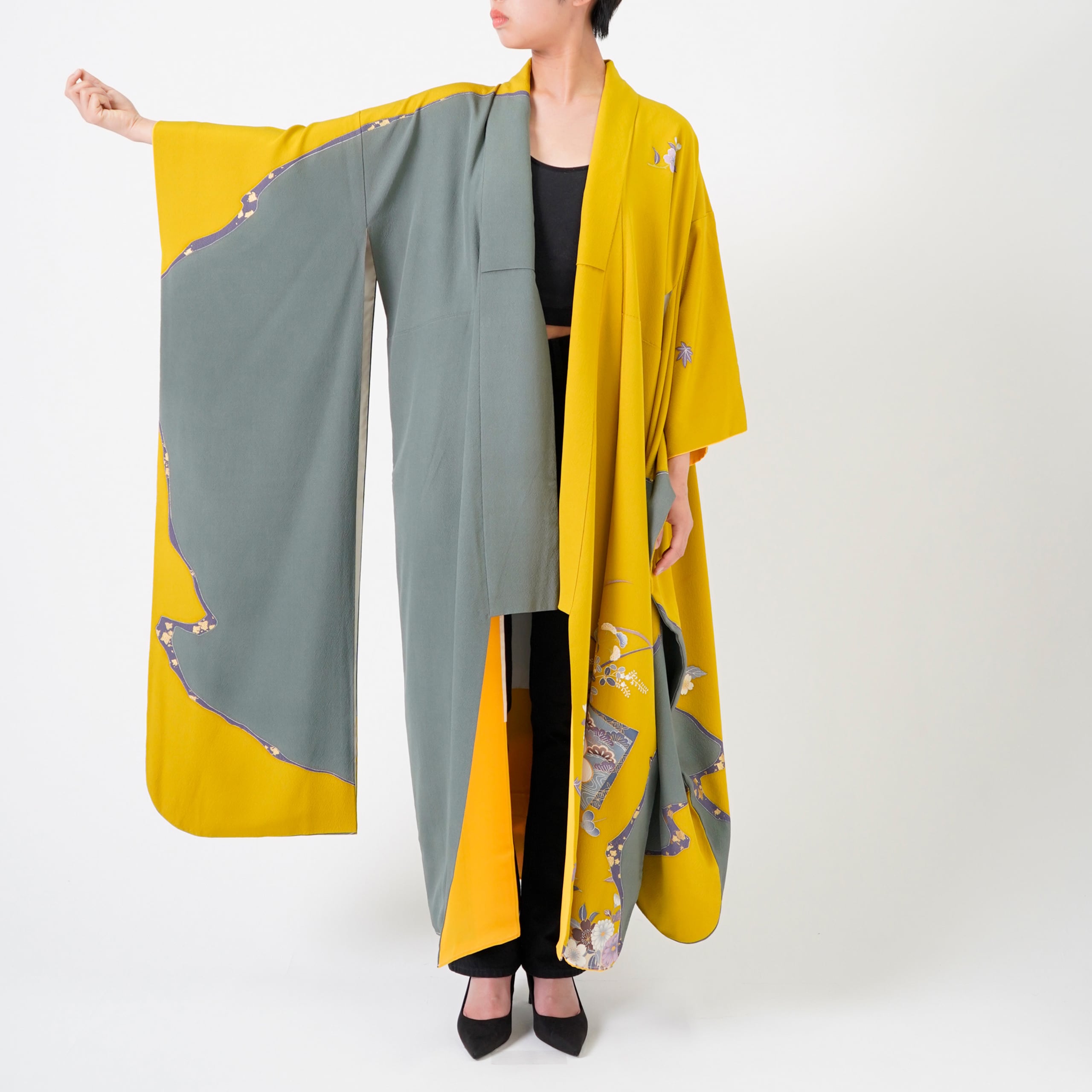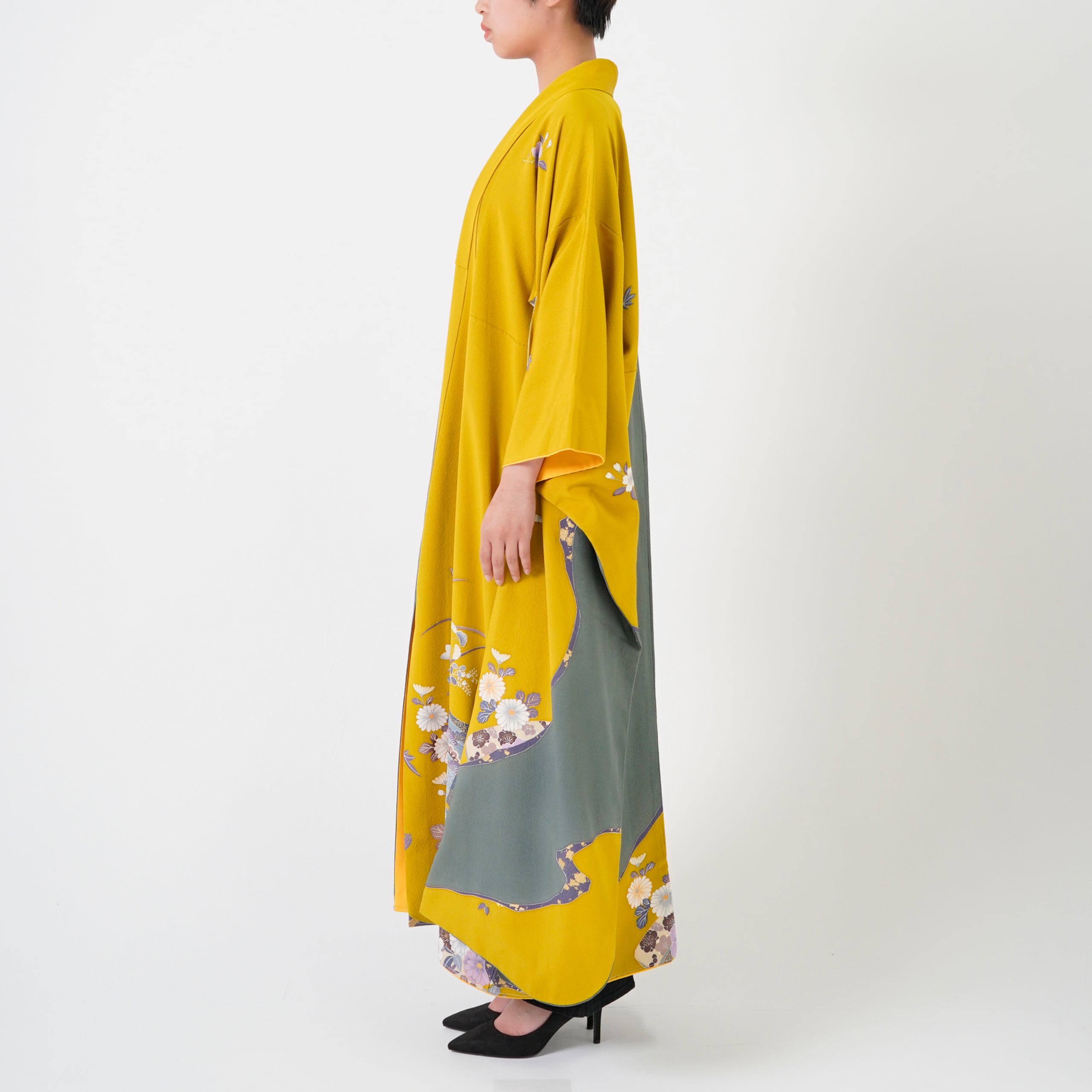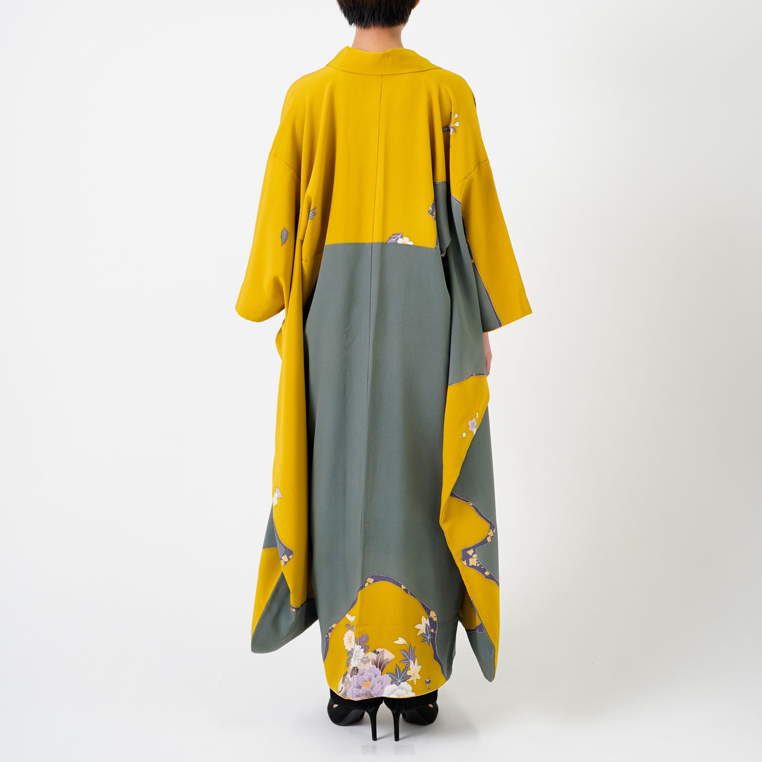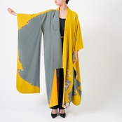 Handcrafted Robe from Vintage Kimono - Yellow Flower Grass Design D017